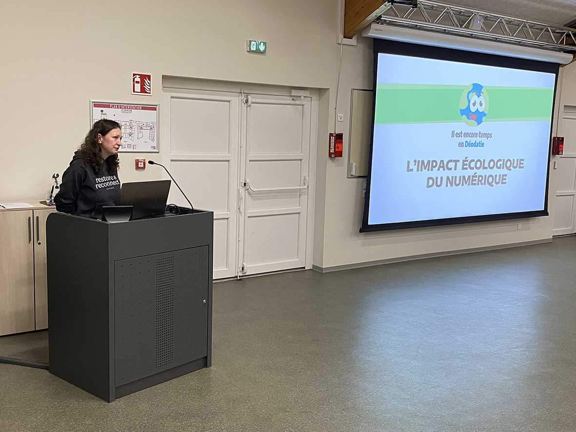 - La deuxième conférence avec Séverine GUTIERREZ, membre de l’association “Il est encore temps en Déodatie“ autour du même sujet en expliquant cette fois l’état des lieux en France. Elle a abordé les questions des Smartphones : cycle de vie, impact environnemental et sociétal, du cloud : la face cachée du numérique, de l’essor des nouveaux usages du numérique. Elle a terminé cette conférence en donnant quelques solutions possibles pour réduire cet impact.