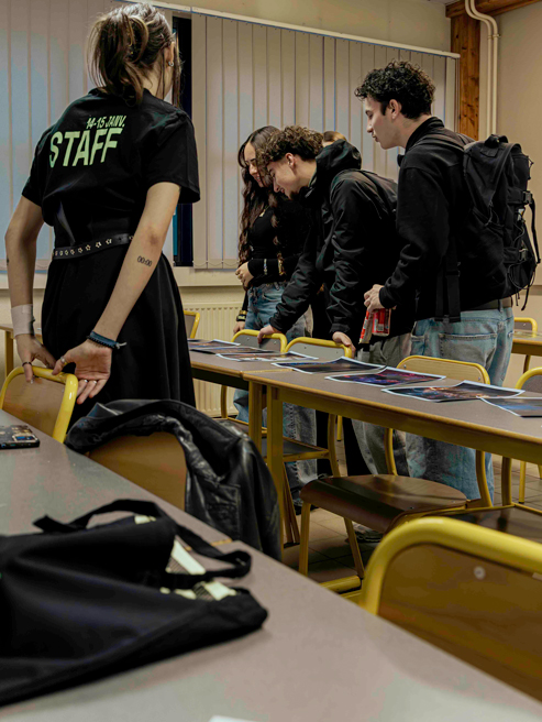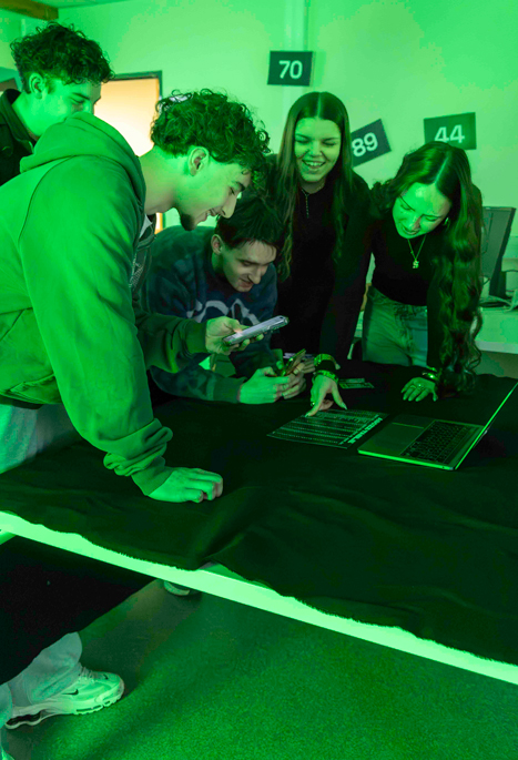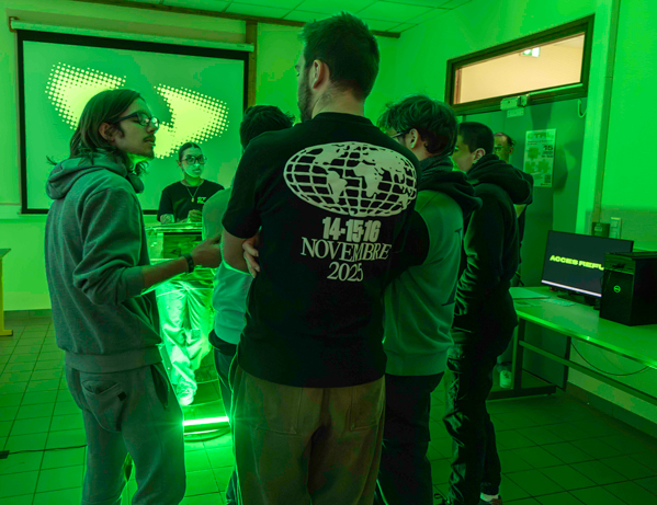 La surprise était totale : les étudiants pensaient assister à des cours classiques. Dès leur arrivée, une vidéo d’introduction les a plongés dans une ambiance futuriste teintée de vert, signature visuelle du projet. L’équipe organisatrice a ensuite constitué des groupes et les a guidés vers différentes salles thématiques où ils ont dû coopérer, réfléchir, débattre et faire preuve d’esprit critique.