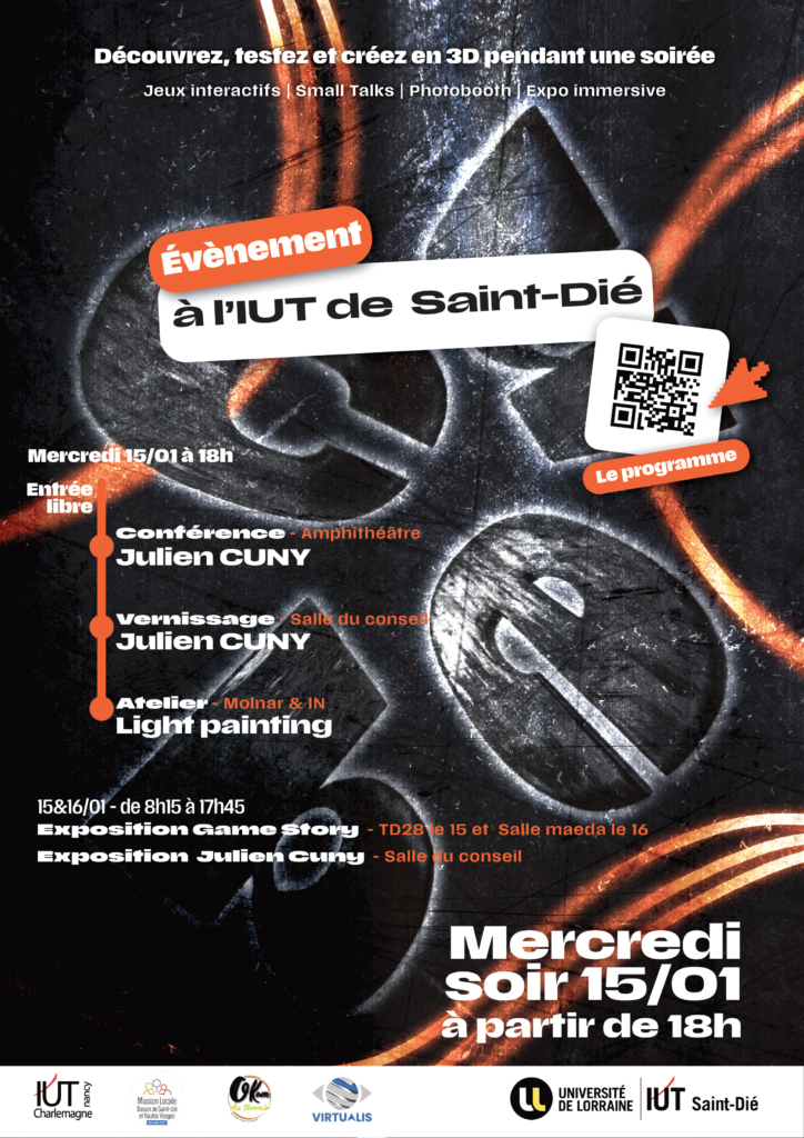 Pendant les deux journées de l’événement, les visiteurs pourront découvrir deux expositions ouvertes au public : Game Story, qui explore l’évolution des consoles de jeux vidéo et de leurs graphismes (par exemple de la 2D à la 3D, et une exposition dédiée à l’artiste Julien Cuny, mettant en lumière ses créations en 3D. Ces expositions seront accessibles à tous, de 8h15 à 17h45, dans les locaux de l’IUT.