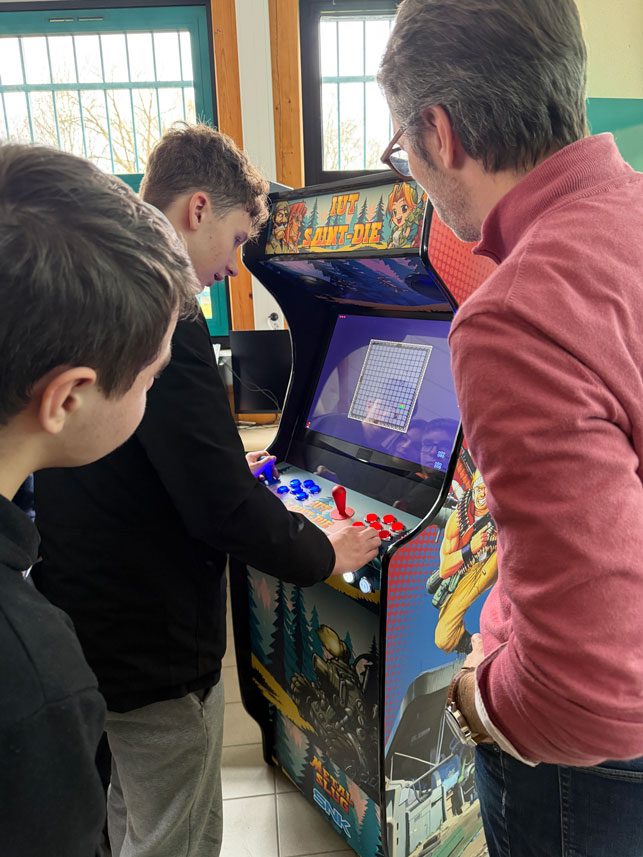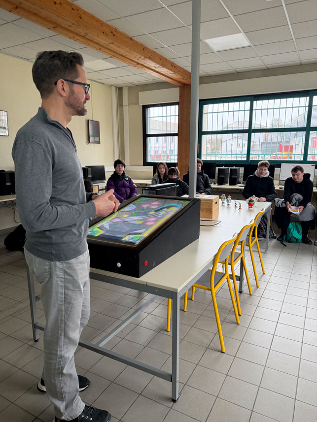 Le troisième atelier était animé par Boris Davin, chef du département Informatique, et Pierre‑Frédéric Villard, enseignant. Les élèves ont exploré les métiers de programmeur, développeur web, expert en cybersécurité, s’appliquer à des démonstrations d’intelligence artificielle (reconnaissance d’objets), des jeux programmés par les étudiants pour borne d’arcade ou flipper et de la peinture 3D.