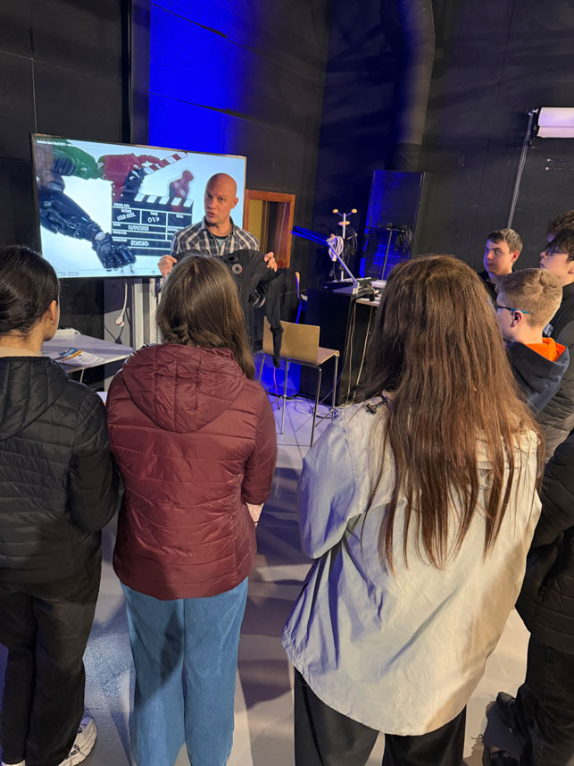 Le premier atelier a conduit les élèves au studio Alice Guy, guidés par Thomas Idoux, responsable de la plateforme audiovisuelle de l’IUT. Ils ont pu découvrir la régie vidéo et la régie son, le plateau de tournage, une combinaison de capture de mouvement et un mapping vidéo sur la devanture de l’IUT.