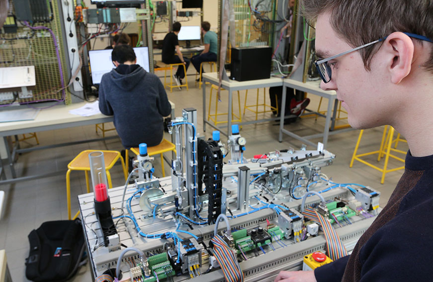 - L’automatisme de base : apprentissage des bases de la programmation et des réseaux en utilisant tous les langages normalisés et plusieurs marques d’automates (Siemens, Schneider, Beckhoff). Les matériels et logiciels font l’objet d’une actualisation régulière afin que les étudiants soient formés sur les produits les plus récents.
