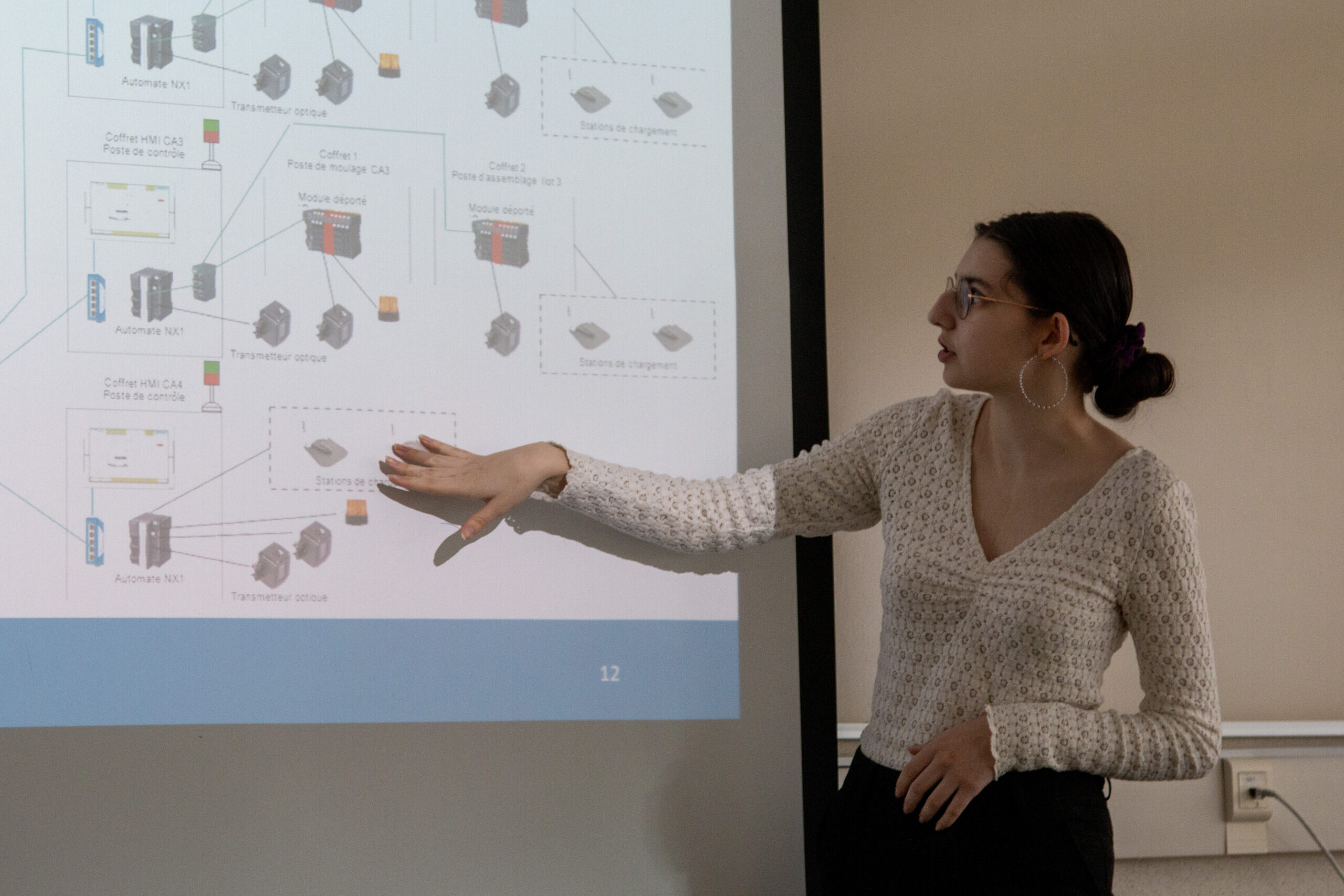 Sarah a principalement travaillé sur l’intégration de véhicules à guidage automatique (AGV) dans les processus de production de Stellantis. Elle avait pour mission de gérer et de modifier le flux des AGV, ainsi que d’ajouter un poste de travail à la ligne de production. Cela nécessitait notamment de modifier l’architecture du réseau, d’ajouter un automate et une interface homme-machine (IHM).