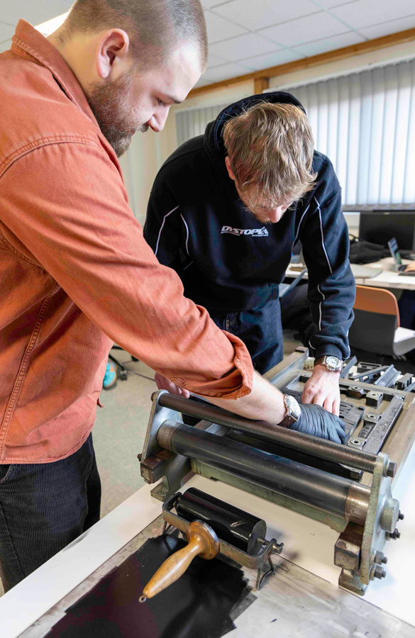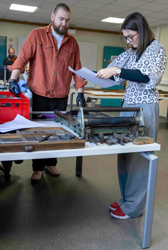 L’atelier Contreforme, spécialisé en micro‑édition, défend une approche qui valorise le lien entre savoir‑faire artisanal, pratique artistique et fabrication manuelle. Les étudiants ont ainsi pu expérimenter des techniques traditionnelles, en manipulant des caractères en bois pour composer et imprimer des mots ou des phrases inspirés de paroles de chansons. Cette immersion leur a permis de comprendre la richesse des outils et des machines qui ont façonné l’histoire de la typographie.