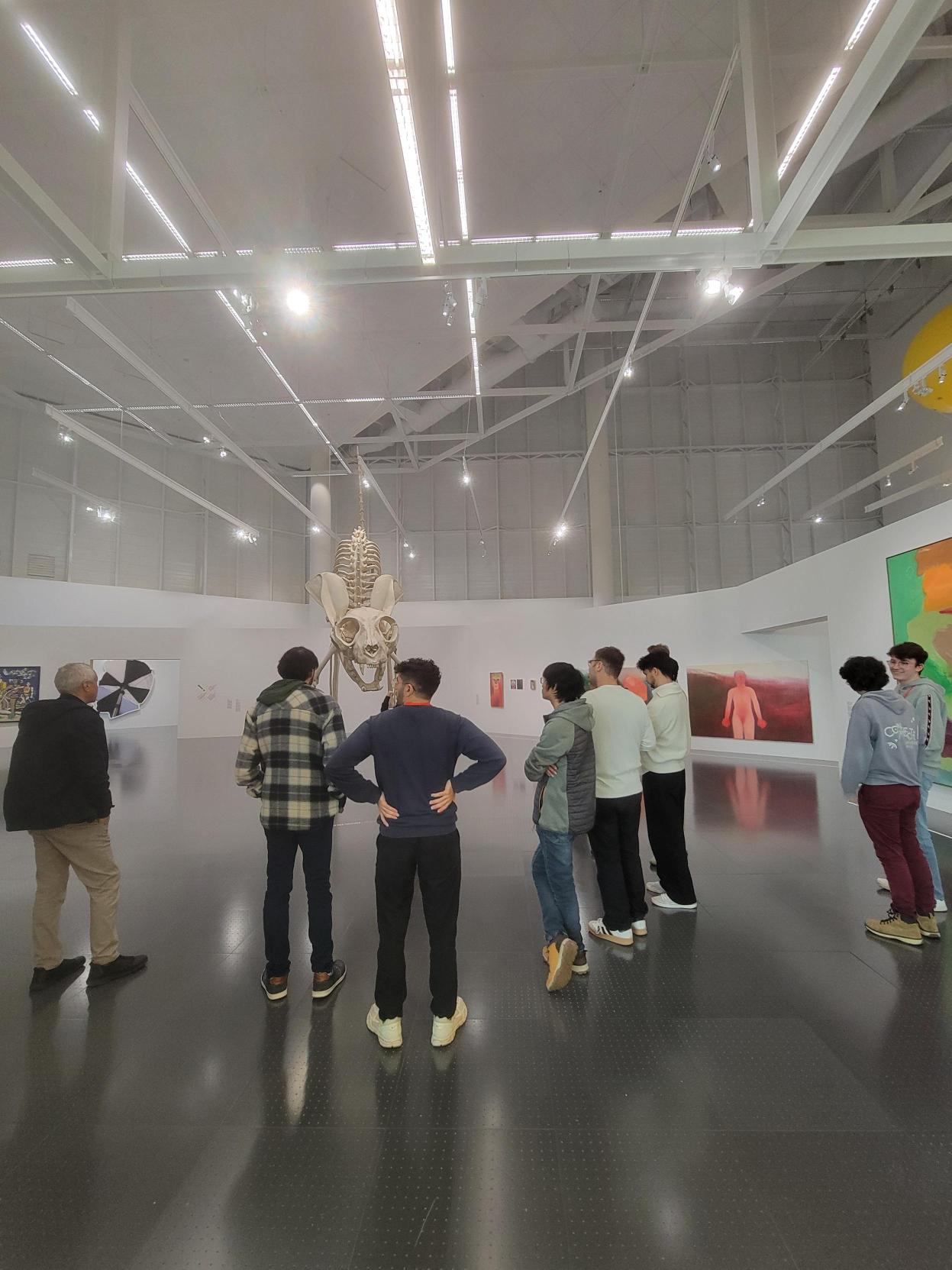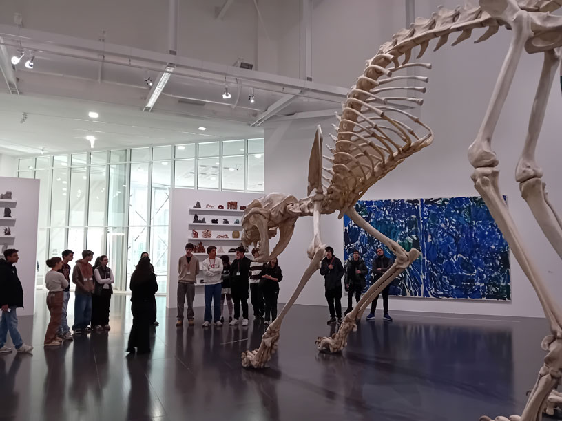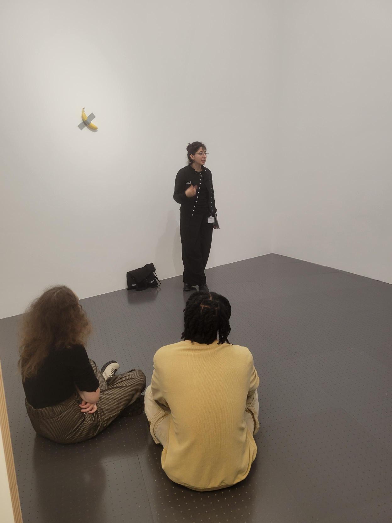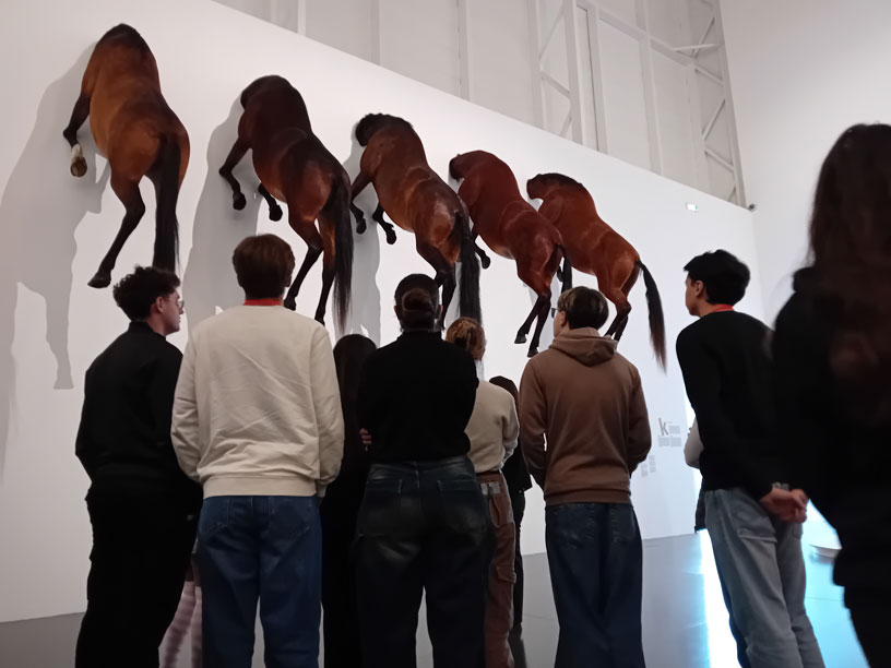 Guidés par une médiatrice passionnée, les étudiant·es ont exploré l’exposition temporaire « Dimanche sans fin. Autour des œuvres de Maurizio Cattelan ». Cette exposition interroge la notion de dimanche, un thème en apparence anodin mais qui révèle des enjeux sociaux, politiques et esthétiques bien ancrés dans notre société. Grâce à des explications accessibles et à une interprétation vivante, la guide a su rendre l’art contemporain compréhensible, presque familier, en montrant comment ces œuvres résonnent avec notre quotidien.